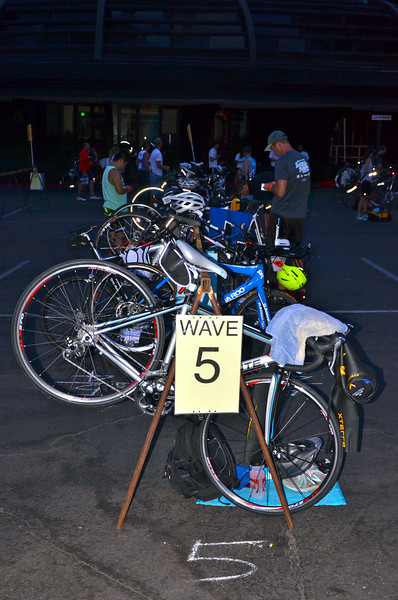 It wasn’t long before transition opened and I snagged an awesome end spot for transition! I kept seeing guys rack their bikes next to mine and was getting confused. Then I realized that I had happened to rack my bike on a tiny wave 5 section that was right next to wave 4 which was a bunch of guys. The other wave 5 sections were actually in the next row. Score for me since I was one row closer to the bike out. I set up my bike and transition area and took a walk around. I then realized that the direction I had intended to grab my bike and go out was not the optimal way since there were those parking things on the ground blocking the way. I had to switch my bike the other way. I walked around a bit to get an idea of bike in and bike out and then run out.